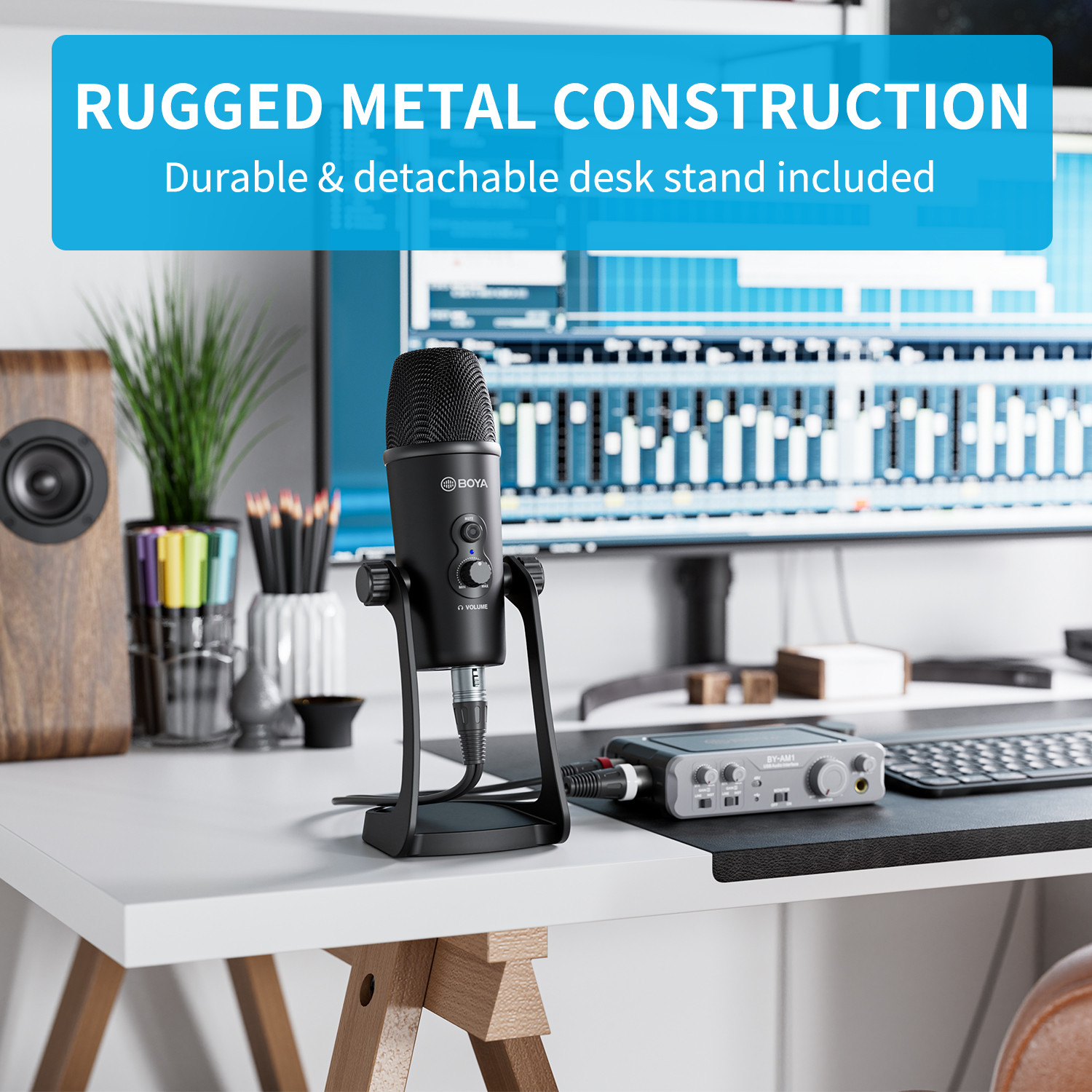 Encased in a durable metal body with a stable, detachable desk stand, this microphone combines professional performance with elegant design. Whether placed on your desk or studio table, it offers both style and substance in one sleek package.