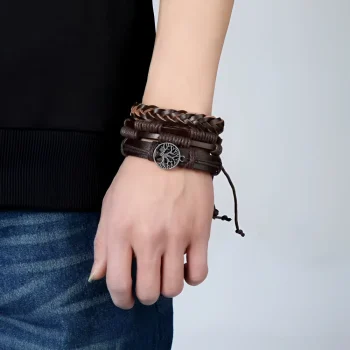 Men’s Handmade Woven Leather Bracelet Set – 3 Pcs Vintage Braided Evil Eye Jewelry