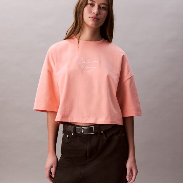 This T-shirt features a boxy, cropped fit that sits comfortably at the waist, offering a relaxed shape that flatters without feeling oversized. The heavy cotton jersey fabric gives it structure while remaining breathable, making it ideal for spring days and mild weather. A classic crew neckline and short sleeves keep the design clean and versatile, while the Calvin Klein chain stitch embroidery on the chest adds a refined branded detail that feels subtle yet distinctive.