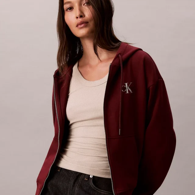 Add the Calvin Klein Jeans Bordeaux Zip Hoodie Sweatshirt to your collection today and step into the season with confidence, warmth, and timeless style!