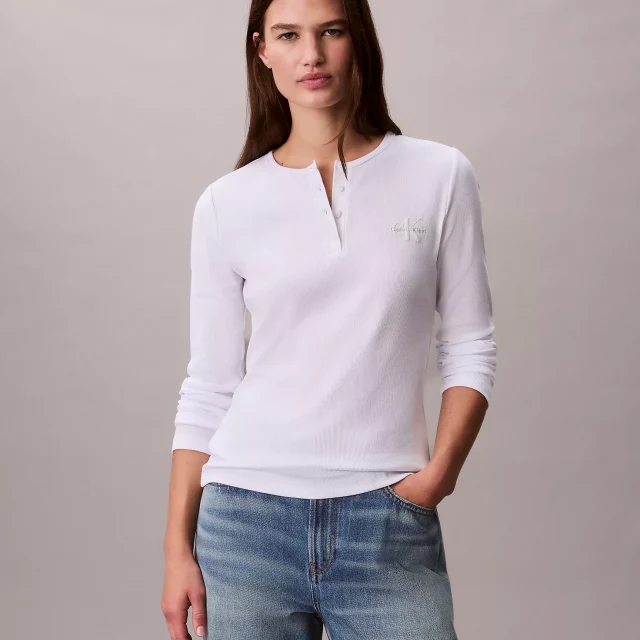 Meet the kind of top you reach for again and again. The Calvin Klein Jeans Monologo Rib Henley T-Shirt is designed for women who love clean lines, soft fabrics, and effortless style. Crafted in a fresh white shade, this long-sleeve top delivers a classic look with a modern feel. It is simple, flattering, and easy to wear, making it a staple piece for your spring wardrobe.