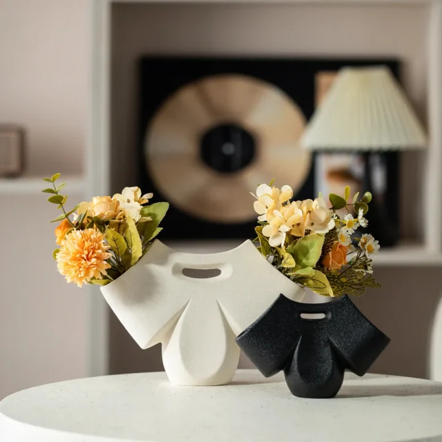 Crafted from premium ceramic with a smooth, non-reflective matte finish, this vase feels luxurious to the touch and looks stunning from every angle. Its dual openings on each “sleeve” invite creative, symmetrical floral arrangements — perfect for dried flowers, pampas grass, or artificial greenery. The small top handle adds an artistic twist, making it not just a vase, but a conversation piece.