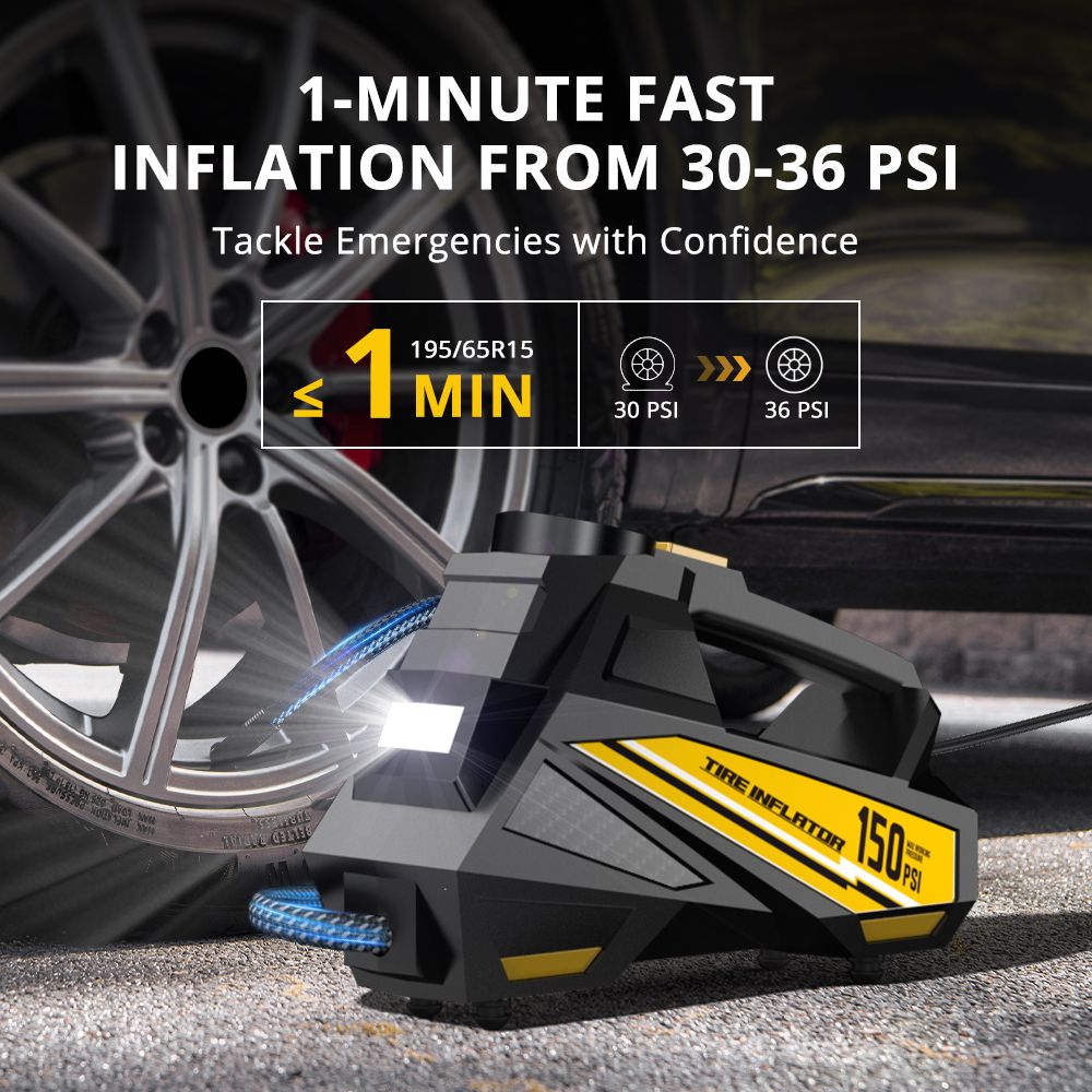 Stay prepared for every drive with a compact yet powerful tire inflator designed for everyday convenience and peace of mind. This 12V corded air compressor delivers up to 150 PSI, making it ideal for quickly inflating car tires, motorcycle tires, bike tires, sports balls, and more. Just plug it into your vehicle’s 12V outlet, set your desired pressure, and let it do the work. The built-in digital TPMS display helps you inflate with confidence and accuracy every time.