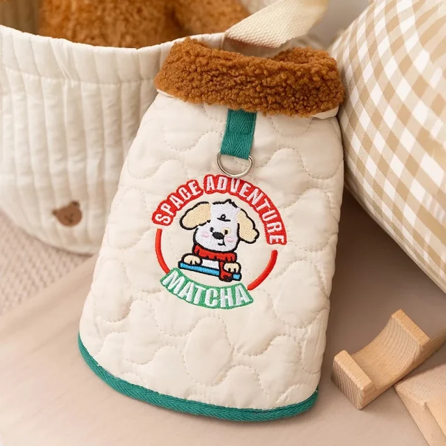 The charming cartoon pattern adds a playful touch while the neutral beige color matches any pet’s style. The thickened padding provides warmth without overheating, making it ideal for cool weather. This jacket is especially suited for breeds like Teddy dogs, Schnauzers, and other small to medium pets.