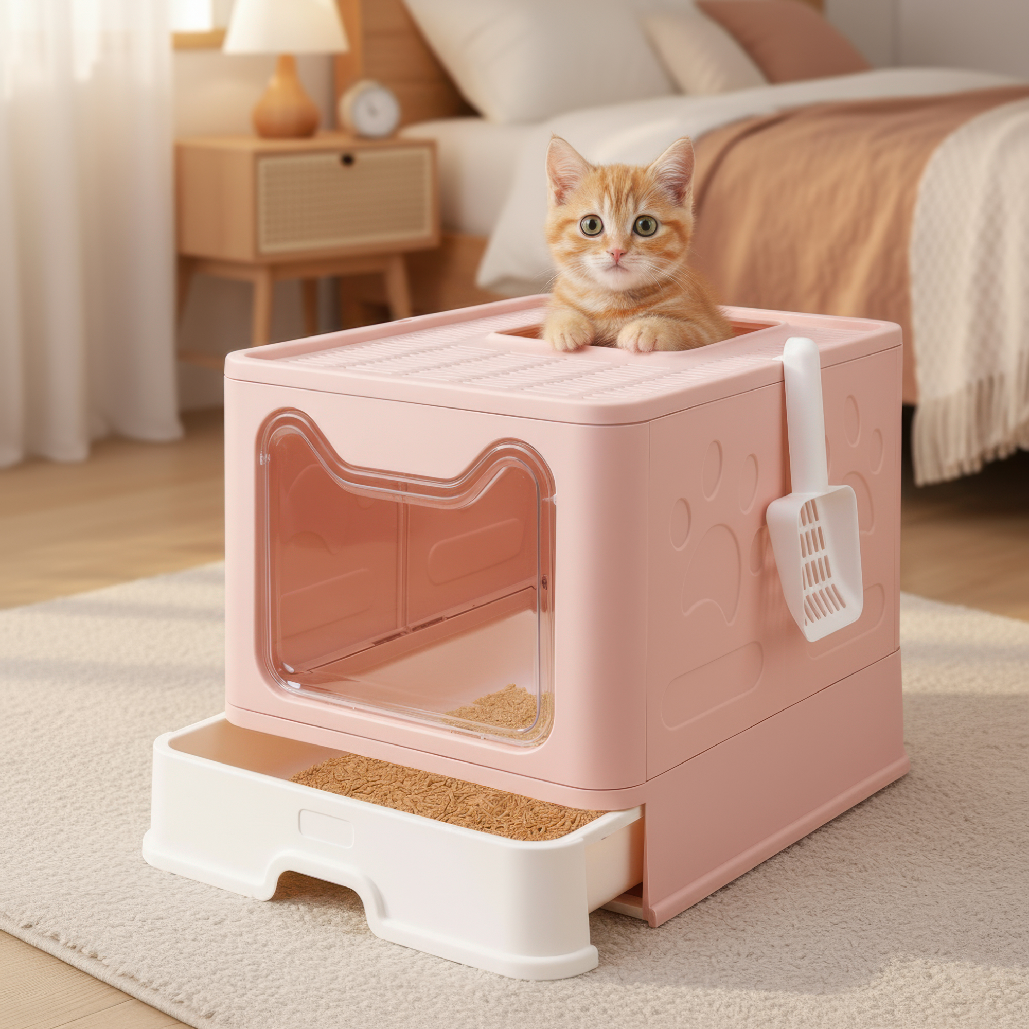 Give your furry friend a clean, private, and comfortable space with this Foldable Cat Litter Box with Lid, Mat & Scoop. Designed for convenience and cleanliness, this spacious litter box is perfect for cats up to 22 lbs. Its modern pink design adds a stylish touch to any room while keeping unpleasant odors under control. Whether you live in an apartment or a large home, this litter box is the perfect blend of function and charm for your feline’s needs.