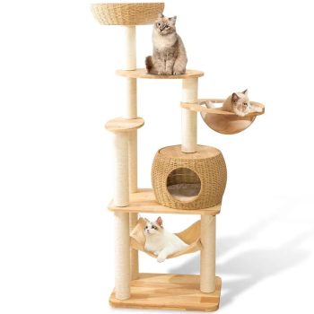 59″ Modern Oak Cat Tree Tower with Sisal Scratching Posts & Space Capsule