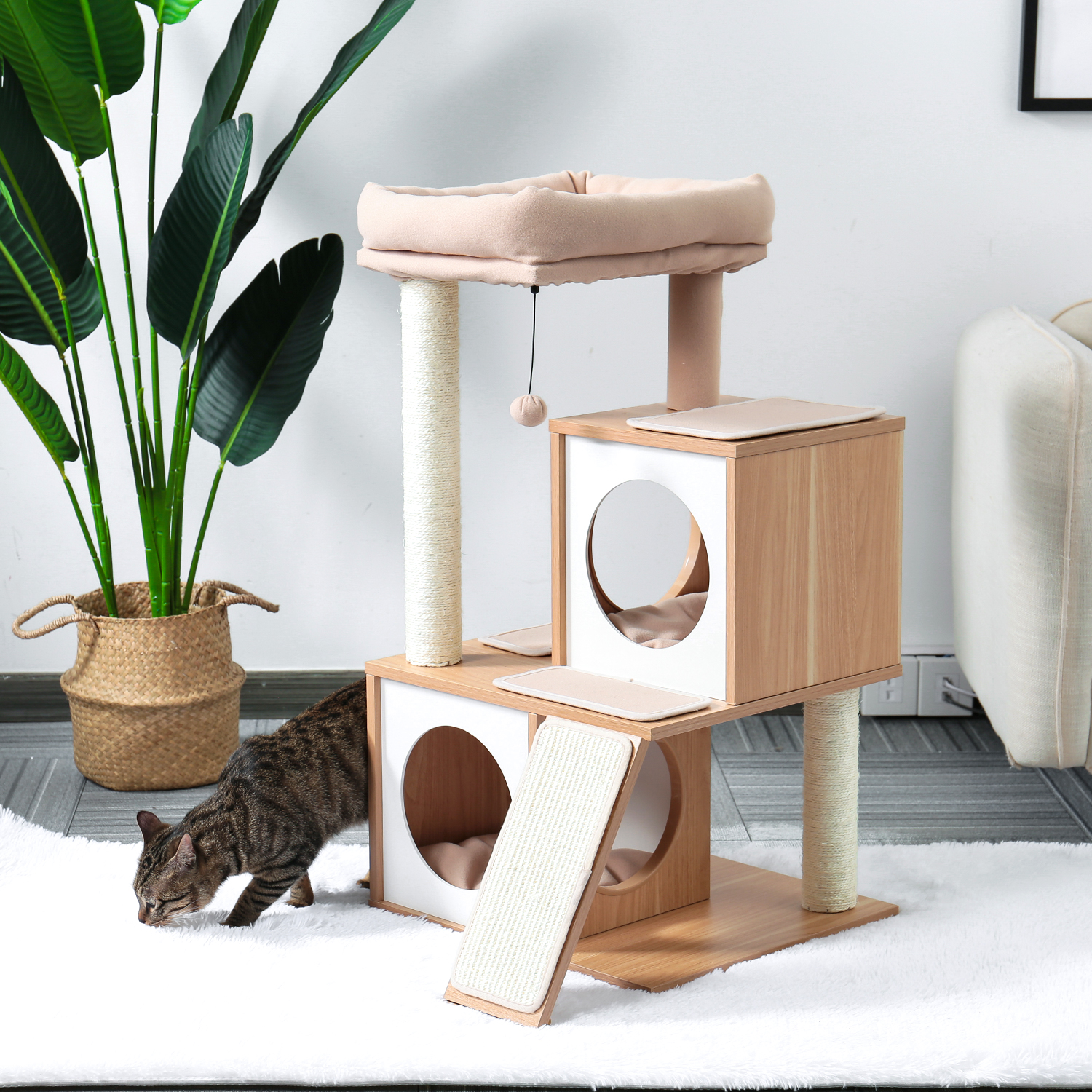 Give your feline a world of comfort, play, and adventure with this beautifully designed Cat Tree House. Crafted in a warm beige tone and sized at approximately 19 x 17 x 35 inches, it blends effortlessly into any home while offering endless fun. With its mix of modern wooden elements, multi-level layout, and fully wrapped sisal posts, this activity center is built to satisfy your cat’s natural instincts — from climbing and scratching to lounging and observing.