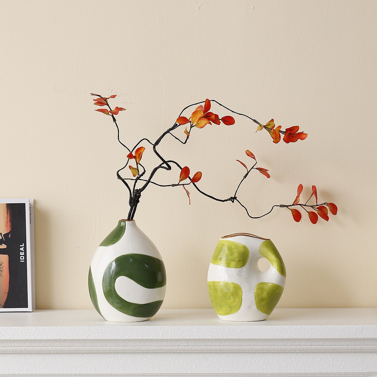 Bring charm, color, and personality into your space with this modern green ceramic cartoon vase. Designed to stand out while blending effortlessly into contemporary interiors, this small tabletop vase features a cheerful cartoon-inspired look paired with a stylish geometric pattern. The smooth ceramic finish and calming green tone make it a delightful accent for shelves, coffee tables, desks, or nightstands.