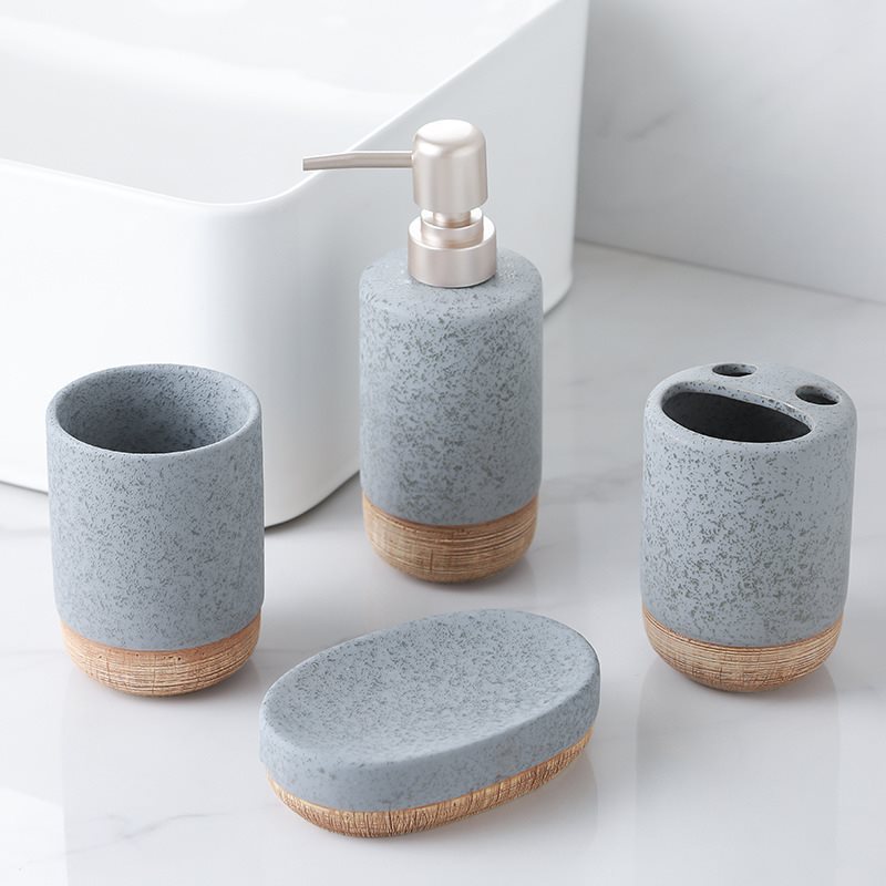 This elegant set isn’t just about looks — it’s designed to make your daily routine smoother and more enjoyable. The smooth ceramic surface feels premium to the touch and resists stains and odors. The wood grain base enhances grip and stability, preventing slips and spills. Each piece complements the other, ensuring your bathroom looks neat and coordinated at all times.
