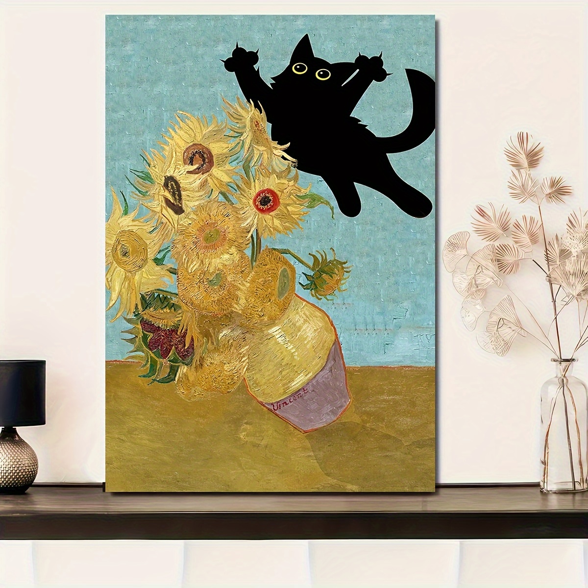 With its unique design, this canvas art is perfect for cat lovers or anyone who appreciates the beauty of nature. The bright yellow sunflowers and the endearing feline companion are sure to lift your spirits and create an inviting, happy environment. The canvas print is versatile enough to complement various interior styles, from modern to rustic, making it an ideal addition to any home.