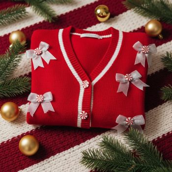 Women’s Y2K Christmas Knit Cardigan with Candy Bow & Diamonds