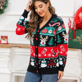 Women’s Christmas Cartoon Cardigan Sweater V-Neck Loose Fit