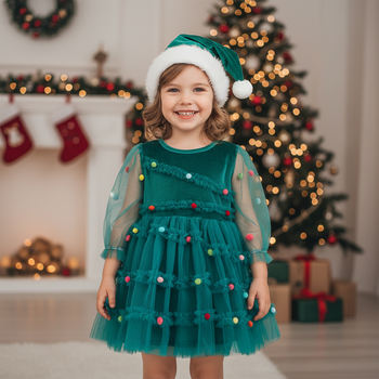 Girls Christmas Tulle Dress and Santa Hat Set with Plush Ball Details