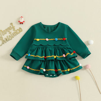 Christmas Baby Girl Romper Dress with Long Sleeves & Pom Layer (0–18M)