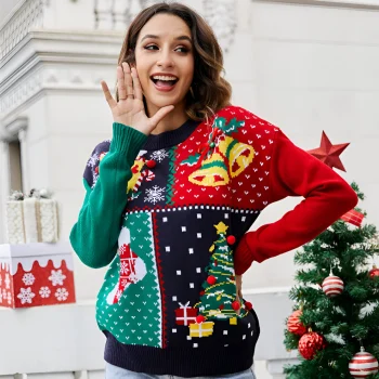 Women’s Ugly Christmas Sweater Color Block Tree & Bell Loose Pullover