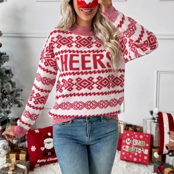 Women’s Red Christmas Sweater with Embroidered Letters & Jingle Bell