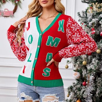 Women’s Christmas Sweater Cardigan V-Neck Knit Red Jacket