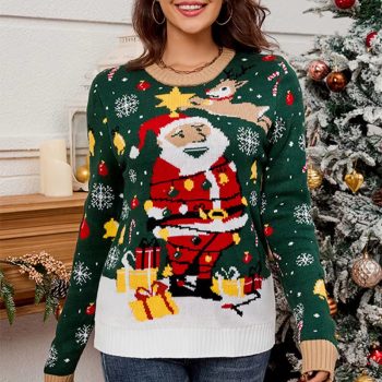 Women’s Funny Color Block Christmas Sweater with Santa – Long Sleeve