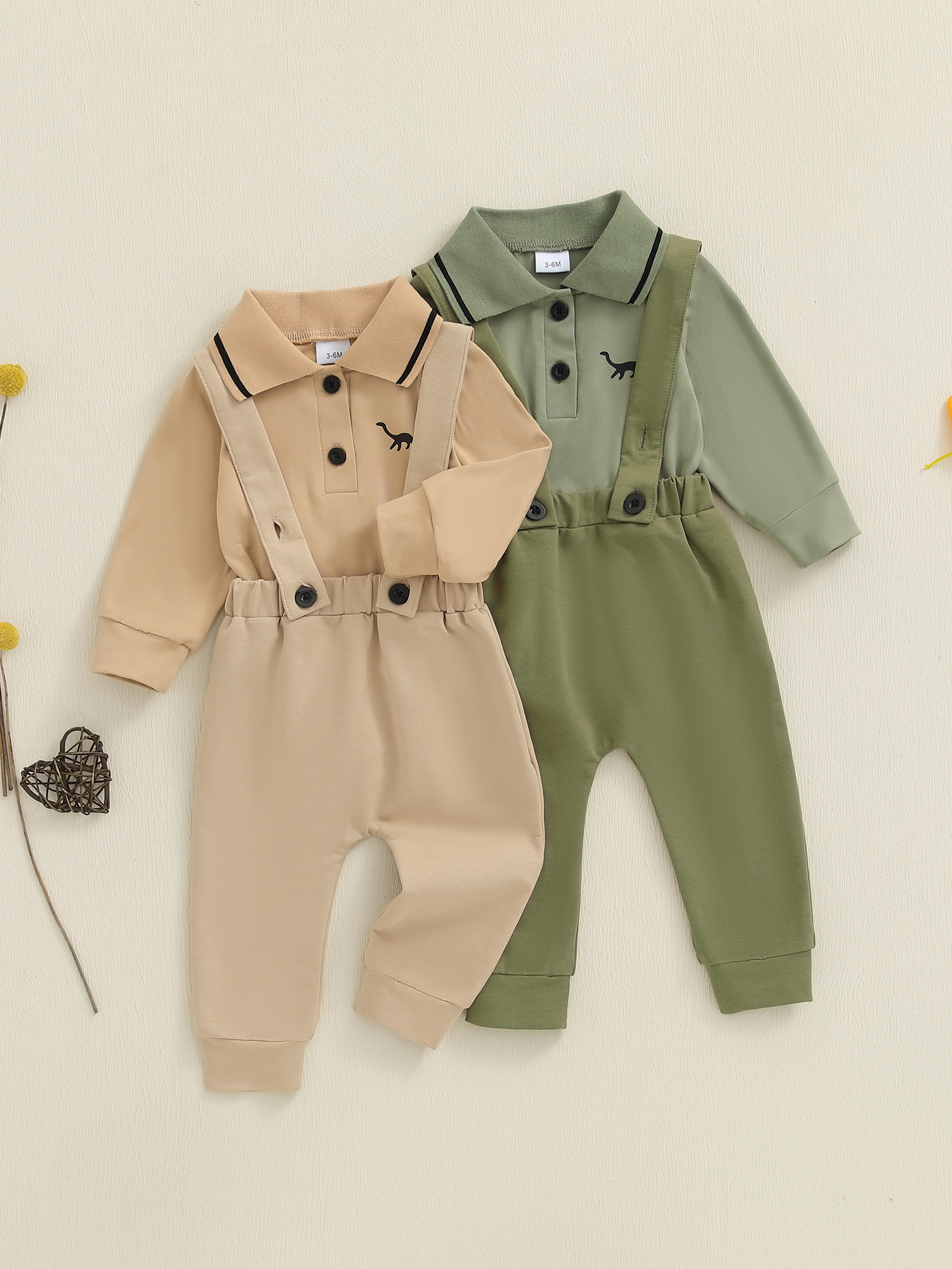 Get your little one ready for the cozy charm of autumn with this delightful 2-piece baby boy outfit. Featuring a long sleeve lapel romper with playful dinosaur embroidery and matching elastic waist suspender pants, this set brings comfort and cuteness together in one irresistible look. Made from a soft blend of 95% polyester and 5% elastane, it’s gentle on baby’s skin and perfect for all-day wear.