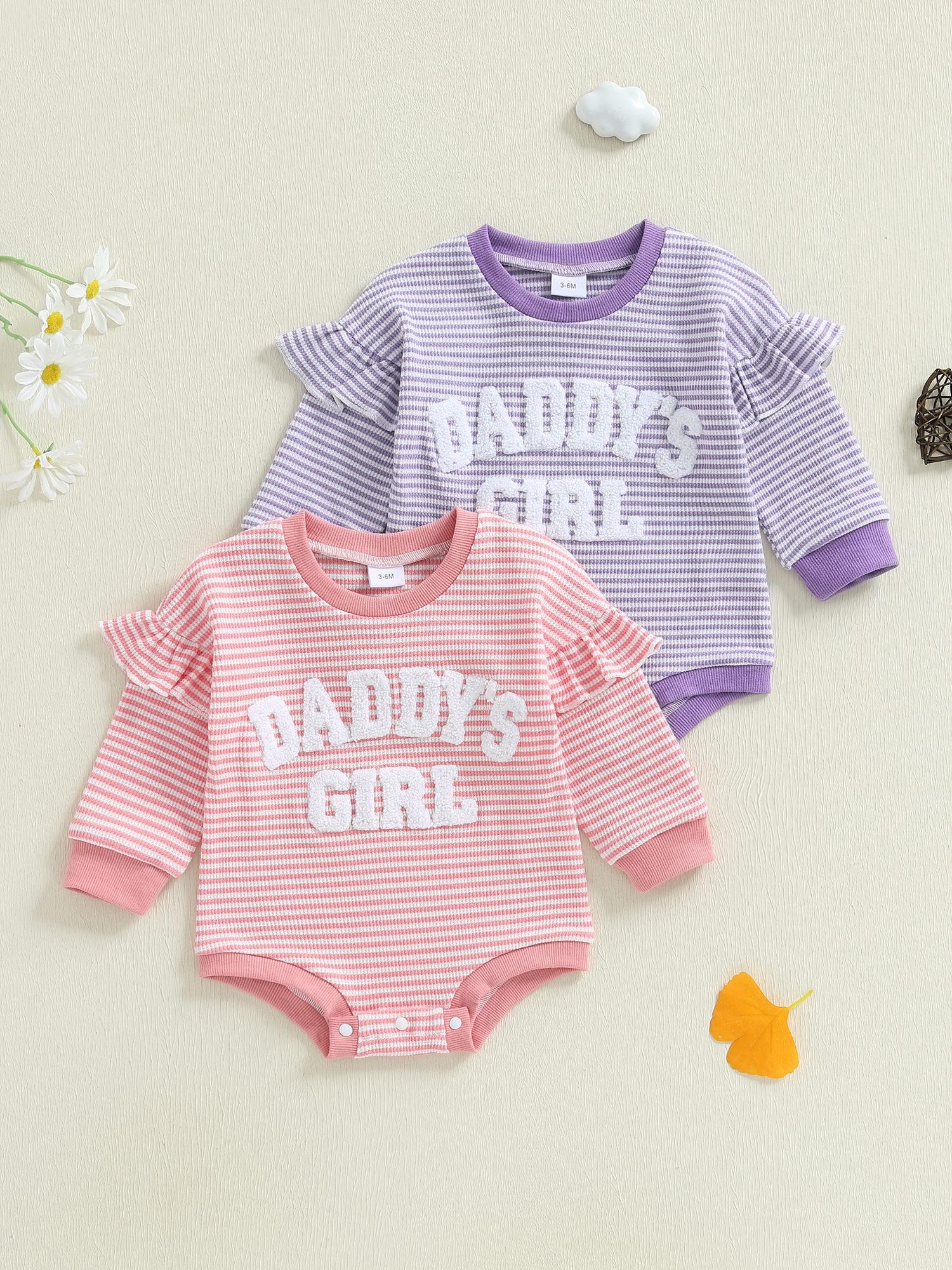 Wrap your baby girl in cozy autumn charm with this adorable striped ruffle jumpsuit. Designed with love and crafted from a soft cotton blend, this romper brings both comfort and cuteness to your baby’s wardrobe. The playful ruffled shoulders and delicate embroidered letters add a touch of sweetness, making it perfect for fall days spent indoors or out. This outfit isn’t just clothing — it’s a memory-maker for every giggle, cuddle, and photo moment.