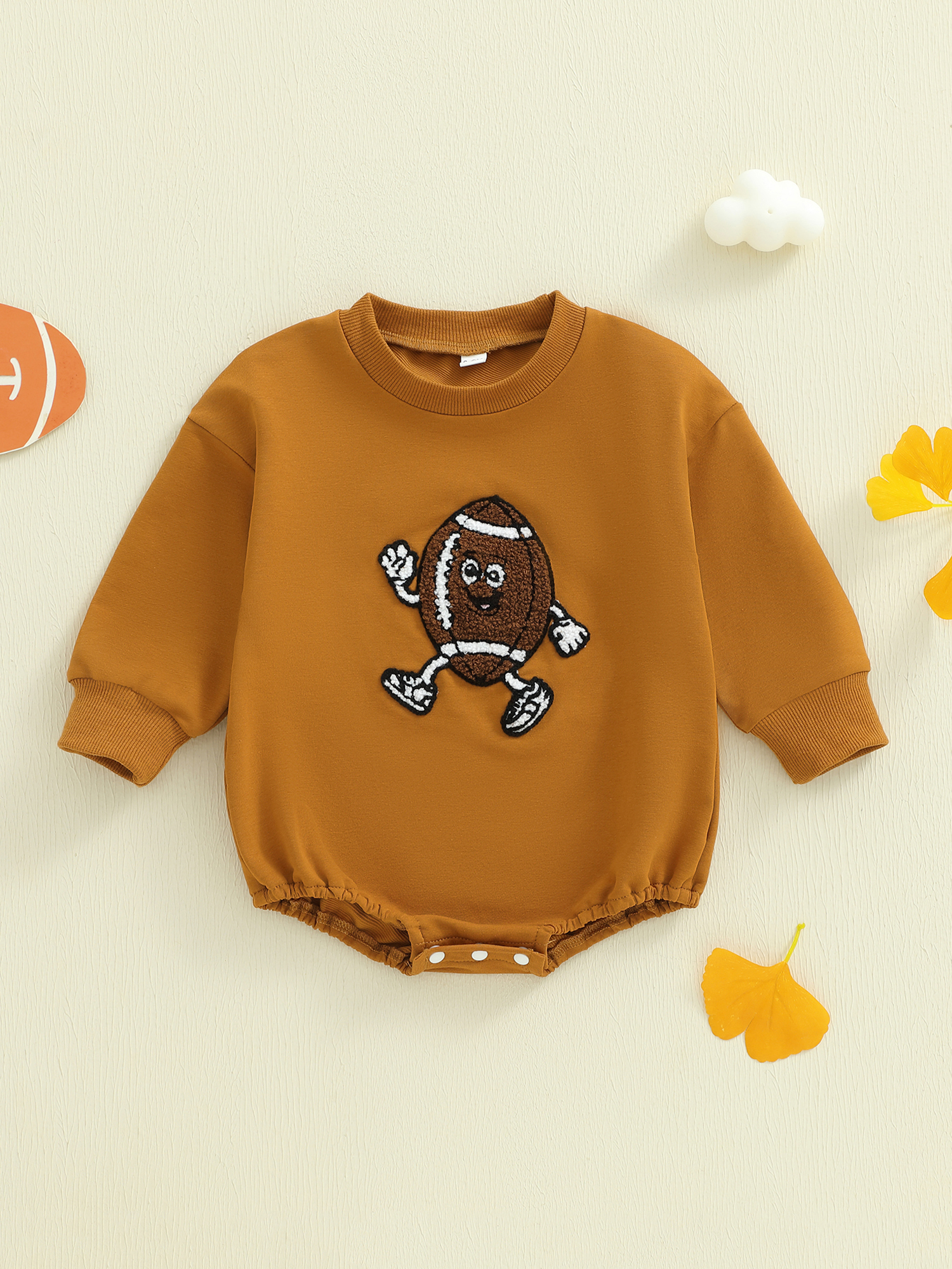 Dress your little star in cozy autumn charm with this football-inspired baby boy romper. Made for newborns and infants, this jumpsuit brings together comfort, cuteness, and sporty style in one irresistible outfit. With its classic round neck, long sleeves, and detailed rugby embroidery, it’s the perfect choice to keep your baby warm and stylish during fall days.