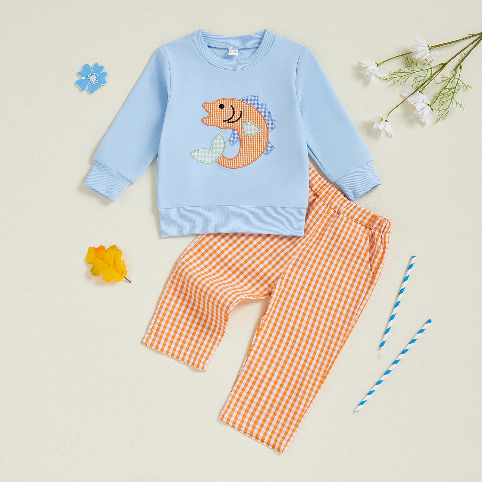 Get your little boy ready for crisp autumn days with this charming 2-piece fall outfit. Designed for comfort and cuteness, this set includes a soft long sleeve sweatshirt with delightful embroidered fish details and a pair of stylish plaid pants. It’s an easy outfit that combines playful charm with everyday practicality, perfect for active toddlers on the move.