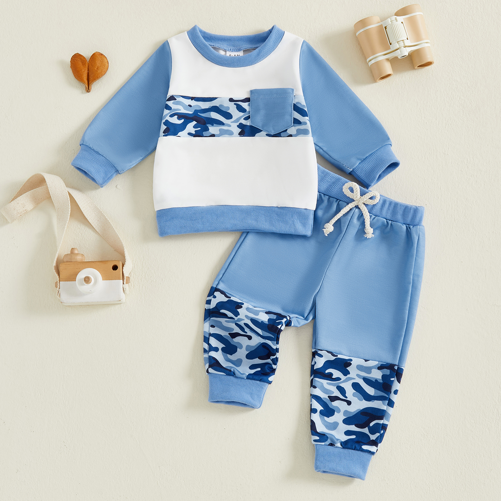 Get your little one ready for the season in comfort and style with this charming toddler boy fall outfit set. Featuring a soft long sleeve pullover with eye-catching camouflage patchwork and matching elastic waist pants, this two-piece set brings together casual charm and playful flair. Perfect for cool autumn days, this outfit will keep your toddler cozy while letting him move freely on every adventure.