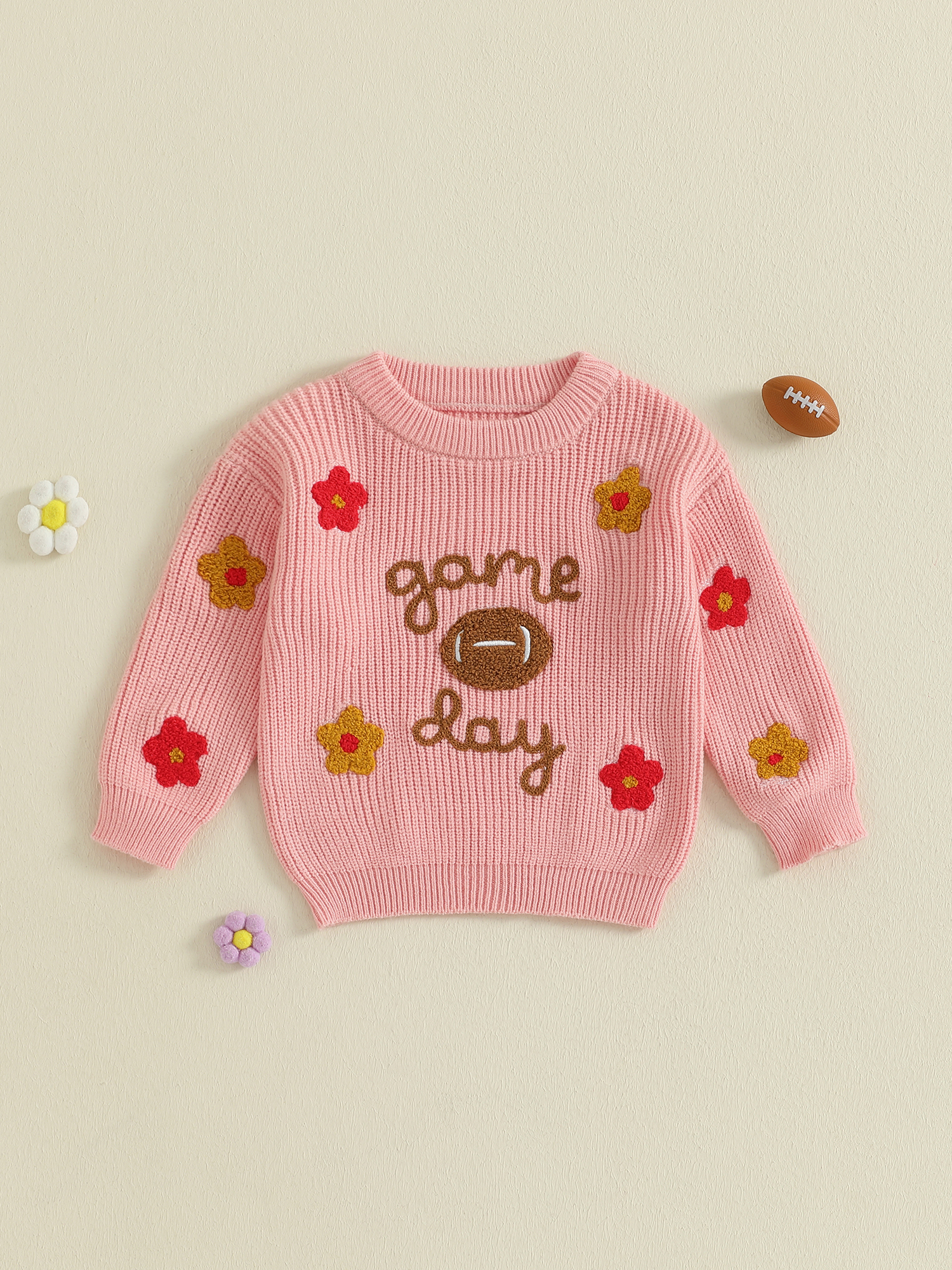 Wrap your little girl in comfort and cuteness this fall with this charming football flower embroidered knit sweater. Designed with love and crafted from a soft blend of polyester, polyamide, and viscose, this cozy pullover brings warmth and style to chilly autumn days. The playful football and flower embroidery adds a touch of whimsy, while the chunky knit design gives it that perfect seasonal look.