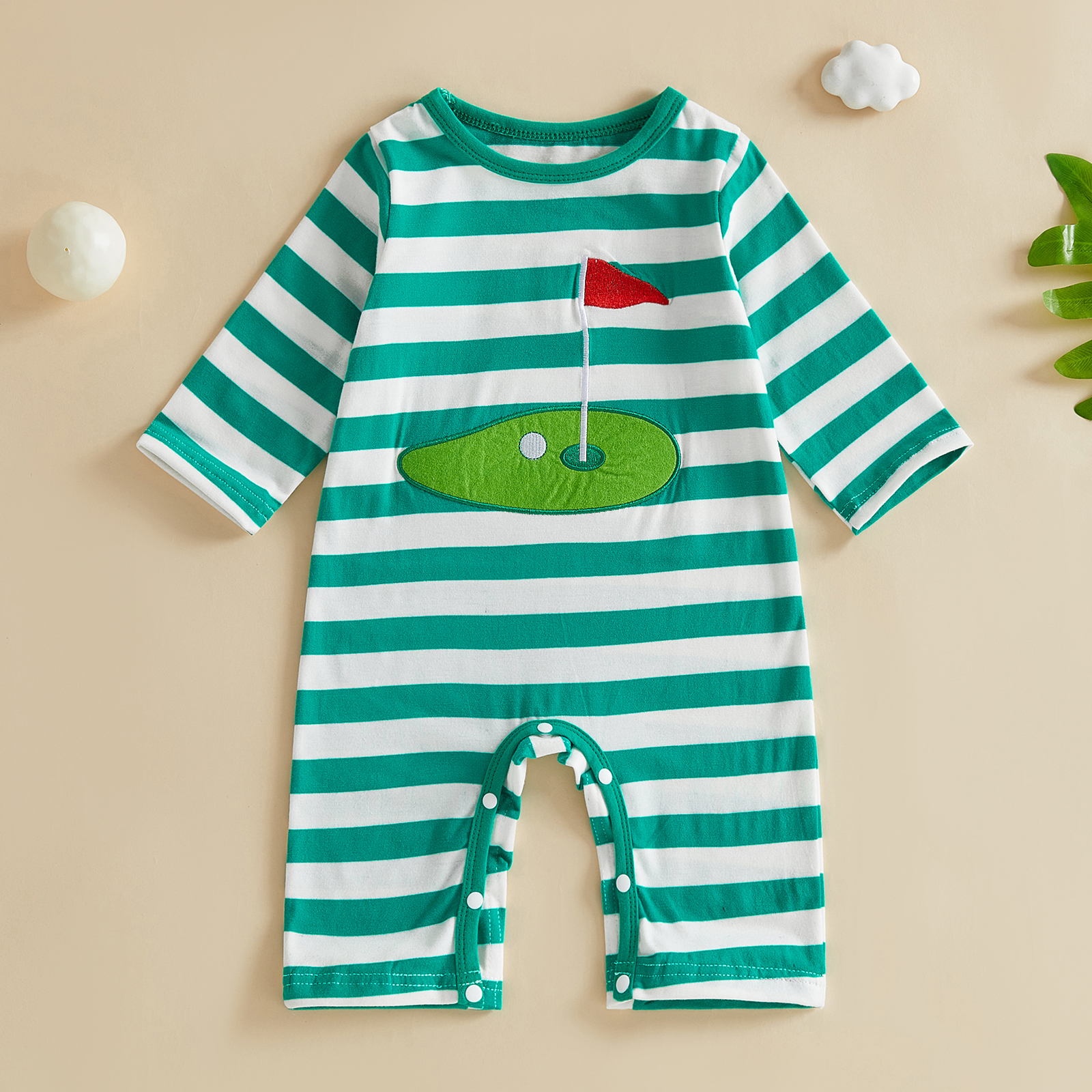 Dress your little gentleman in timeless charm with this adorable striped long sleeve romper. Designed for comfort and cuteness, this one-piece outfit features a soft cotton-blend fabric, a classic crew neckline, and a sweet golf-themed embroidery that adds a playful touch. The stylish stripes give it a clean, preppy look that’s perfect for everyday wear, family outings, photos, or special occasions. Your baby will stay cozy, comfy, and effortlessly stylish all day long.