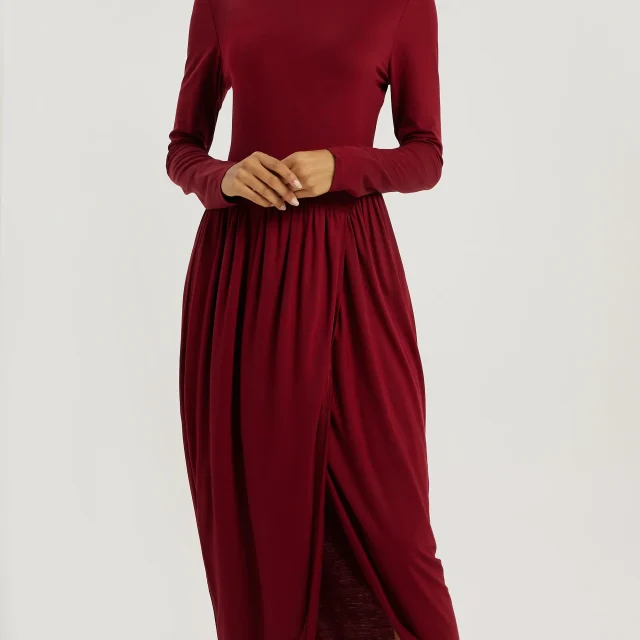 Elevate your wardrobe with this elegant wine red turtleneck bodycon midi dress, designed to make a lasting impression. With its classic pleated design and flattering A-line silhouette, this dress offers a perfect balance of sophistication and comfort. The ankle-length cut creates a graceful, feminine shape, while the tiered decoration adds a touch of modern flair. Ideal for all seasons, this versatile dress can be dressed up or down for various occasions, making it a must-have piece for your collection.