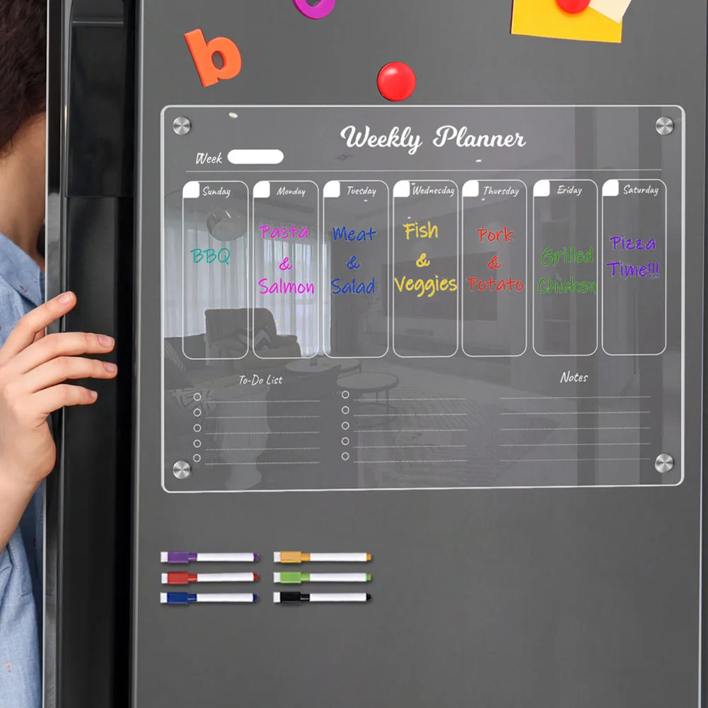 This acrylic fridge planner isn’t just another whiteboard—it’s a lifestyle upgrade. Whether you’re managing a family’s weekly meals, tracking school assignments, or planning work tasks, this board keeps everything visible at a glance. It’s perfect for households that thrive on coordination or individuals who want to add structure to their days without sacrificing aesthetics.