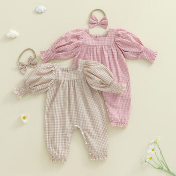 Baby Girls Plaid Fall Romper with Long Sleeves and Bow Headband