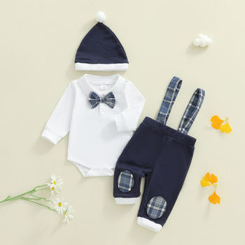 Baby Boy Long Sleeve Romper with Plaid Overall Pants, Bow Tie & Hat Outfit