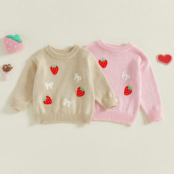 Newborn Baby Girl Knit Sweater Pullover with Strawberry Bow Embroidery
