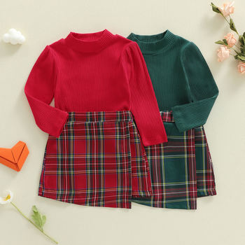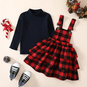 Girls Christmas Plaid Suspender Dress & Ribbed Top Set