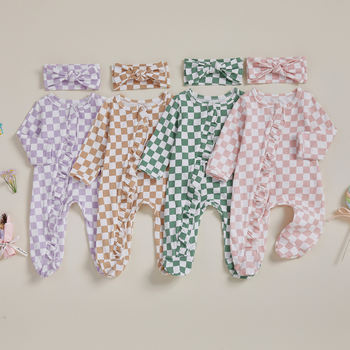 Baby Girl Checkerboard Ruffle Trim Fall Romper & Headband Set