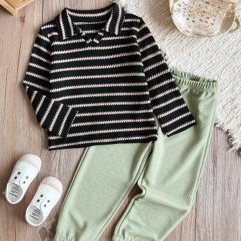Boys’ French Fresh V-Neck Striped Shirt & Waffle Pants Set