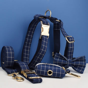 Dark Blue Check Dog Collar, Leash, Harness & Bow Set