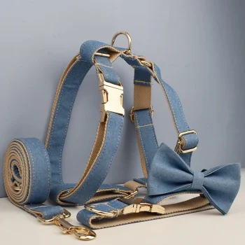 Denim Dog Collar, Leash & Harness Set with Bow Tie and Flower