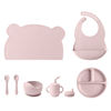 Introduce your little one to confident self-feeding with this complete 7-piece silicone feeding set. Designed for babies and toddlers, it includes a suction bowl, divided dining plate, soft-tip spoon, training sippy cup, and a waterproof bib—everything you need to make mealtime smoother from the very first bite. Crafted from high-quality, BPA-free silicone, this set is gentle on tiny mouths, durable for daily use, and easy to clean.