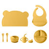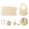 Each piece in the set is made to support growing eaters. The bowl and plate feature strong suction bases to help prevent spills, while the spoon is soft, flexible, and safe for sensitive gums. The waterproof bib keeps clothes dry and clean, and the training cup encourages little hands to practice independent drinking. With a solid, modern design and smooth edges, this set is safe, stylish and perfect for everyday meals.