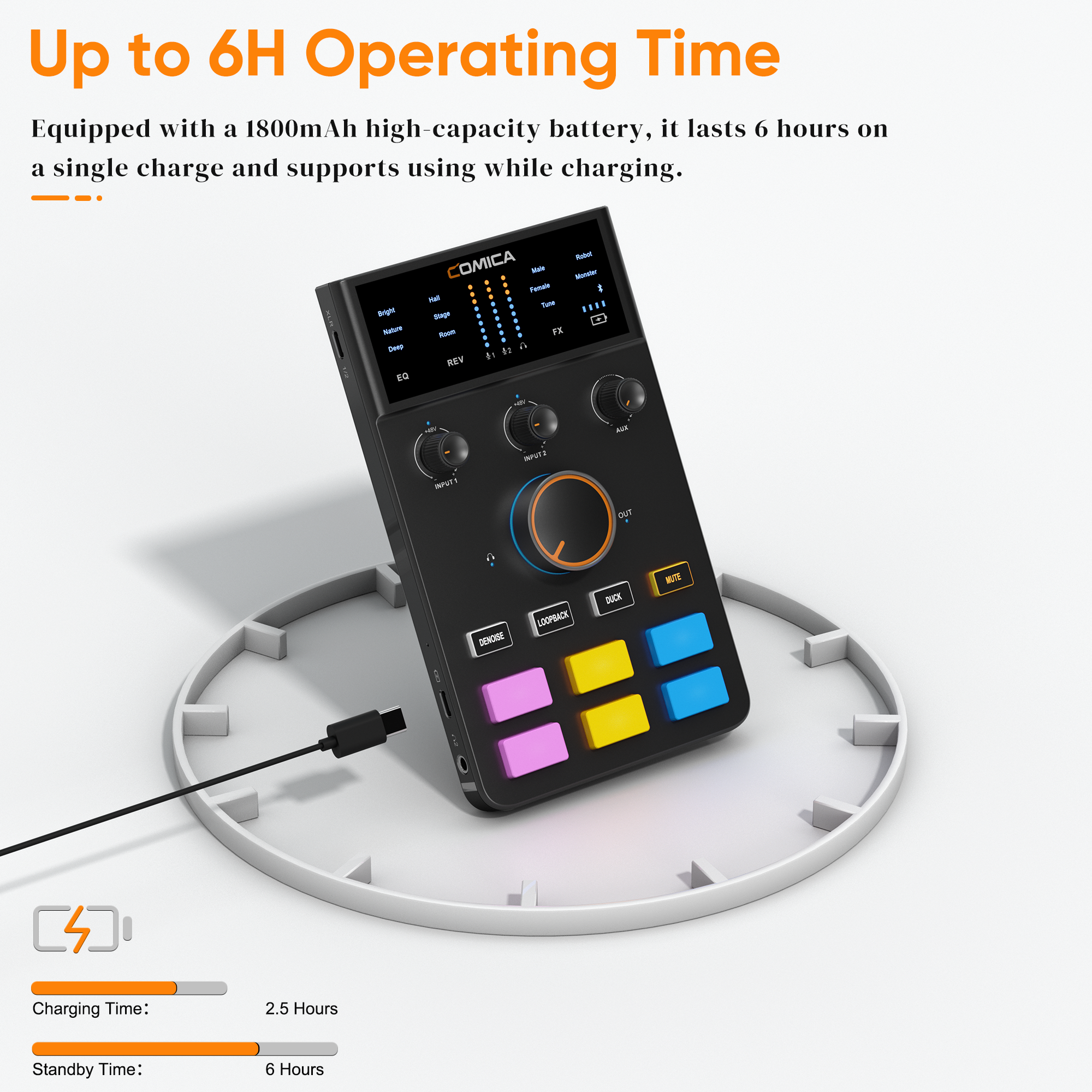 Enjoy full control with individual mic preamps offering up to 60dB gain, real-time monitoring, EQ modes, reverb effects, and playful voice filters. Five preset sound effects — plus one you can fully customize — help build energy and personality in every live session. A built-in pop filter and shock-mounted capsule ensure smooth, noise-free vocal capture, even in less-than-ideal environments.