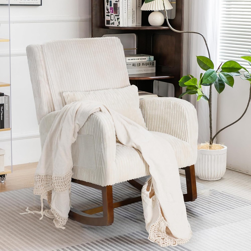 The charm of this chair lies in its perfect blend of cozy comfort and timeless design. Unlike basic rockers, it features generous, thick padding on both the seat and backrest, ensuring you stay comfortable during extended sits. Wrapped in premium corduroy fabric, it offers a uniquely soft and inviting texture that feels as good as it looks. Paired with sturdy, curved wooden rockers that provide a smooth, gentle motion, this chair creates a haven of tranquility wherever you place it.
