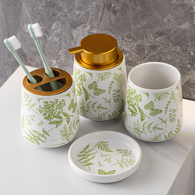 Crafted from high-quality ceramic, this bathroom accessory set is built to last. The stunning gradual green plant pattern not only brings a fresh and calming aesthetic but also creates a relaxing atmosphere. Each piece is expertly designed, ensuring you have durable and easy-to-clean accessories that maintain their beauty over time. You can trust this set to withstand daily use without fading or degrading in quality.