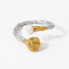 Make a striking statement with this beautifully designed ring that blends contemporary style with timeless elegance. The lava-textured finish paired with an opening pearl-inspired silhouette creates a unique design that instantly stands out. Crafted with 18K gold plating and accented with dual tones of gold and silver, this ring is both eye-catching and versatile. Perfect for anyone who wants a touch of sophistication without sacrificing individuality.