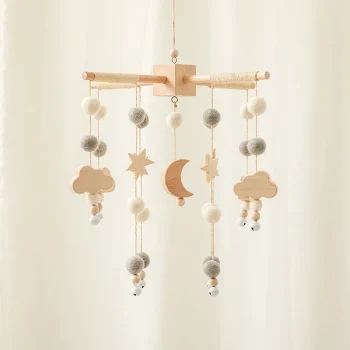Wooden Baby Mobile Bed Bell with Moon & Clouds Rattle – Montessori Crib Toy