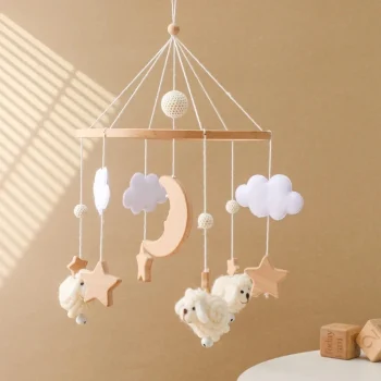 Wooden Star Moon Baby Bed Bell Rattles Toy – Soft Felt Cloud & Sheep Crib Mobile