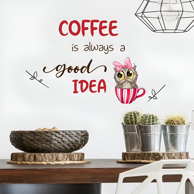 Use this cute owl coffee wall sticker to freshen up your home décor anytime you want to make your kitchen or café feel more inviting. It’s especially ideal for morning coffee corners, restaurant backgrounds, or café walls that need a fun and cozy accent. Whether you’re redecorating your home or enhancing a business space, this sticker makes it easy to create a stylish and welcoming vibe.