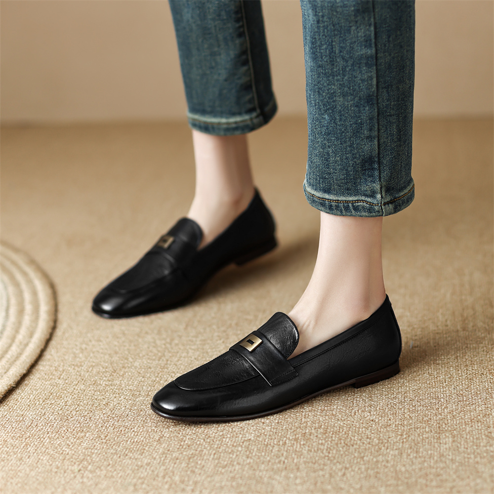 Made from premium cow leather, the upper feels supple yet strong, providing long-lasting wear. The inside features breathable pigskin lining, while the sheepskin insole adds a plush feel underfoot. A subtle 0.4 inch (1 cm) heel offers just enough lift to keep your feet supported, while the classic round toe ensures a roomy, natural fit. The sleek metal decoration on the front adds a touch of modern flair, making these moccasins versatile enough to pair with jeans, skirts, or even tailored trousers.