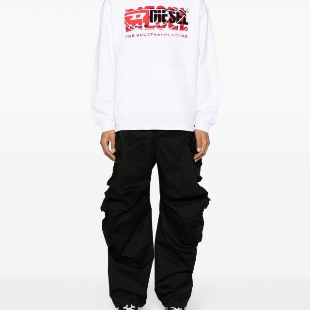 Add the Diesel Men’s White Printed Cotton Hoodie Sweatshirt to your collection and embrace a blend of comfort and contemporary style. Perfect for layering during colder days or wearing solo when the weather is mild, this hoodie is a go-to essential you’ll keep reaching for. Don’t just wear a sweatshirt—make a statement with Diesel.